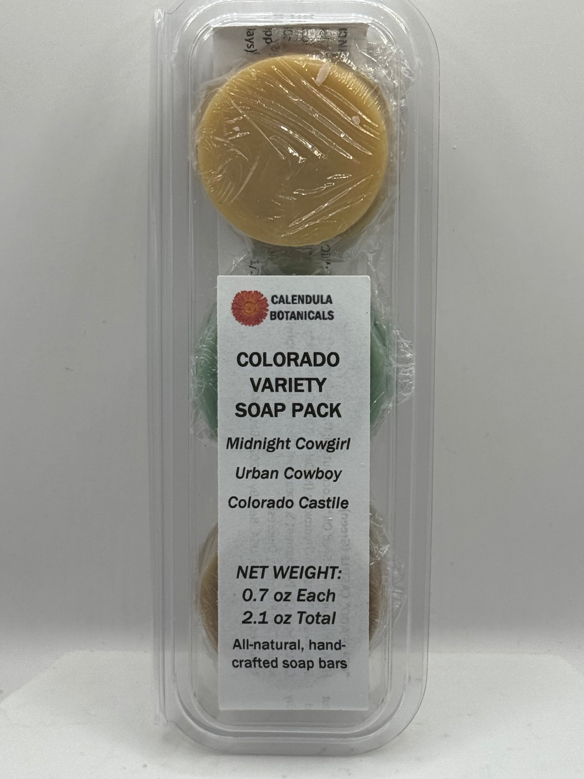 Try three of our favorite, top-selling Colorado Proud* soap bars: Urban Cowboy, Midnight Cowgirl, and Colorado Castille- in Peppermint. Each bar is 0.7 ounces.