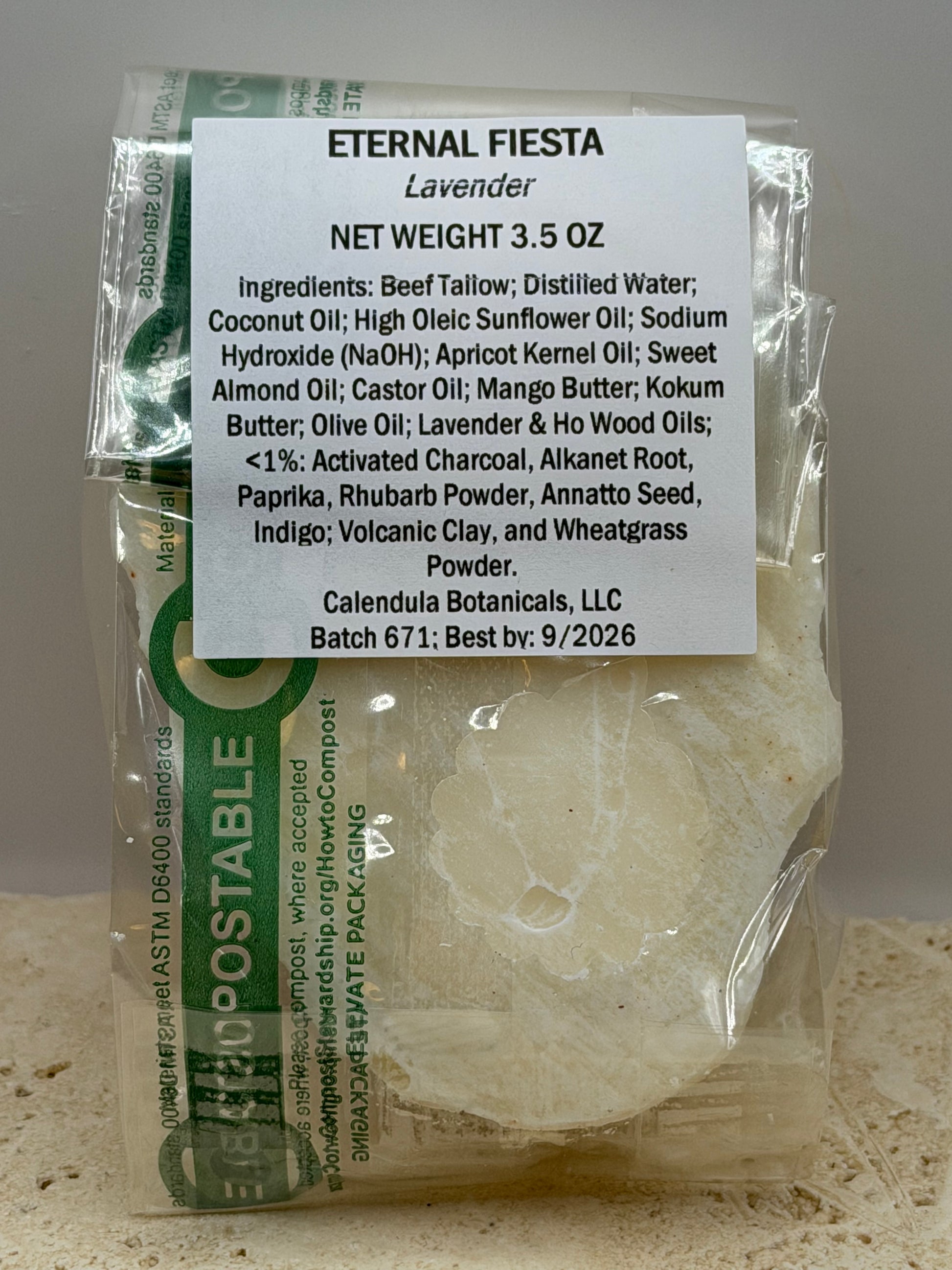 Complete Ingredient List: Beef Tallow; Distilled Water; Coconut Oil; High Oleic Sunflower Oil; Sodium Hydroxide (NaOH); Apricot Kernel Oil; Sweet Almond Oil; Castor Oil; Mango Butter; Kokum Butter; Olive Oil; Lavender Oil & Ho Wood Oil OR Peppermint Oil; <1% Activated Charcoal, Alkanet Root, Paprika, Rhubarb Powder, Annatto Seed, Indigo; Volcanic Clay, and Wheatgrass Powder.