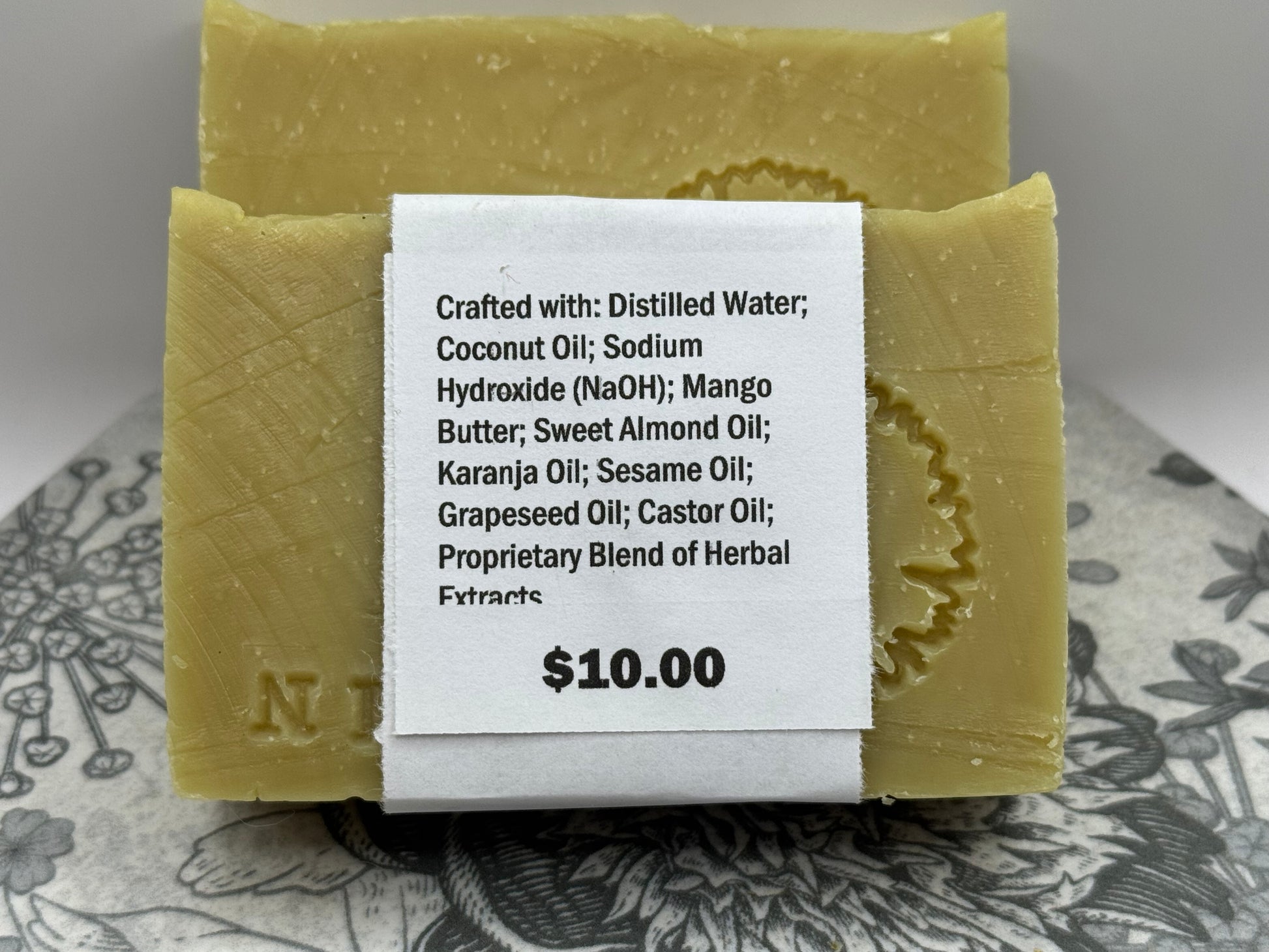 Ingredients: Distilled Water; Coconut Oil, Sodium Hydroxide (NaOH), Mango Butter, Sweet Almond Oil, Karanja Oil, Sesame Oil, Grapeseed Oil, Castor Oil; Proprietary Blend of Herbal Infusions